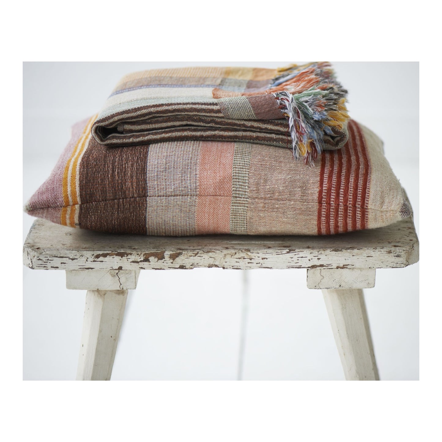 Denne skønne silke pude med uldbetræk med lynlås i siden har et smukt farvet sammenvævet motiv. Den bringer en varm og rig atmosfære til ethvert interiør. Du kan også kombinere den med den matchende plaid.