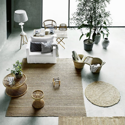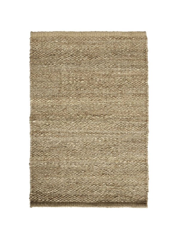 Tæppet er fremstillet i 100% naturfiber og er farvet i naturfarve, hvilket giver små fine farvevariationer, som gør hvert tæppe unikt. Der vil fremstå små knuder, hvor jutegarnet afsluttes inden vævningen.