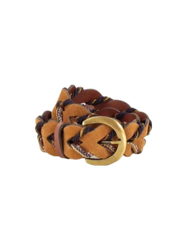 Bælte med glidespænde i patchwork af kolæder, ruskind og stof.