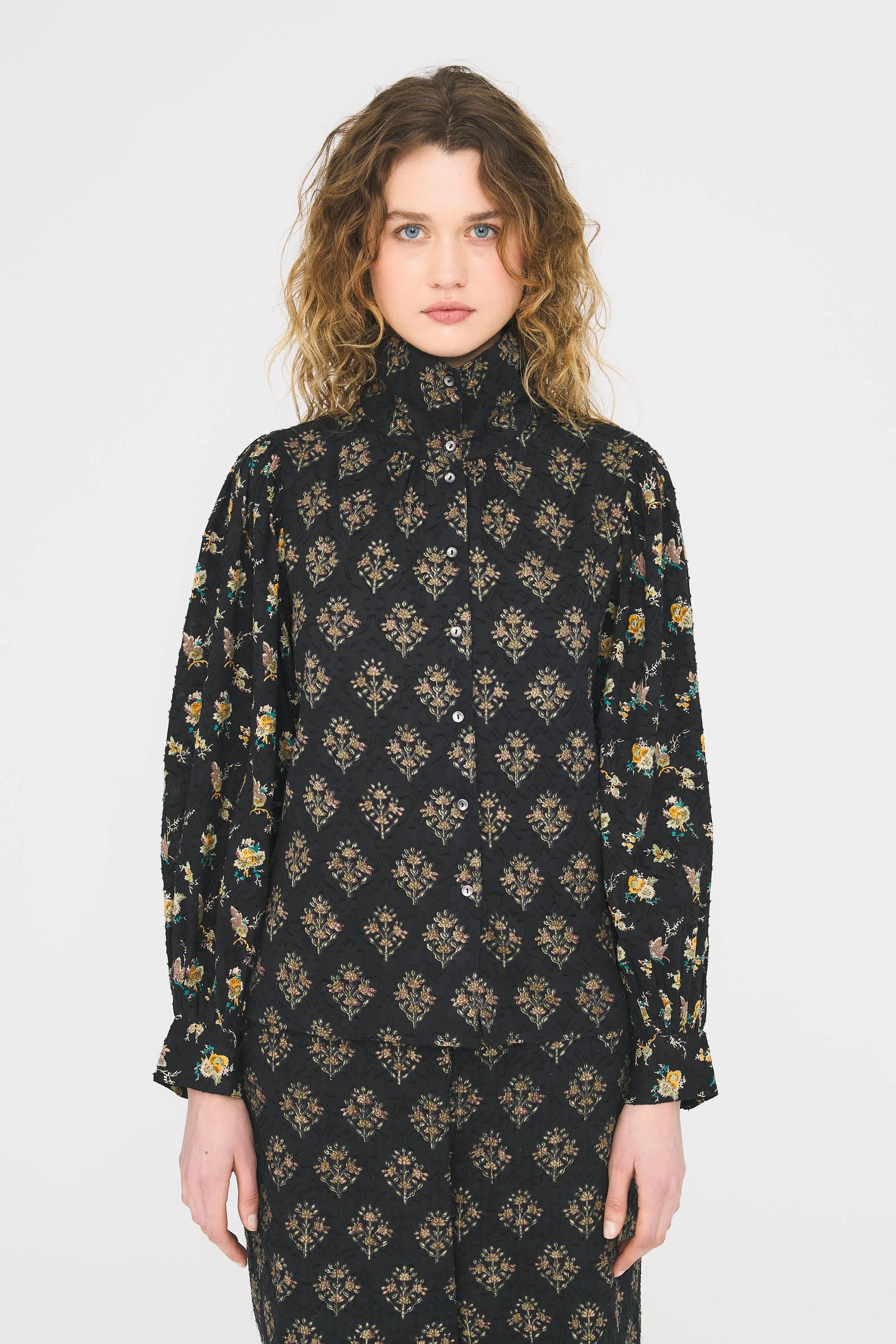 Jacquardbluse i bomuld. Løs pasform. Høj krave. Blusen er lavet af bomulds-jacquardstof, en væveproces med fil-coupé-effekt. De synlige tråde på forsiden af beklædningsgenstanden er et karakteristisk træk ved dette stof.