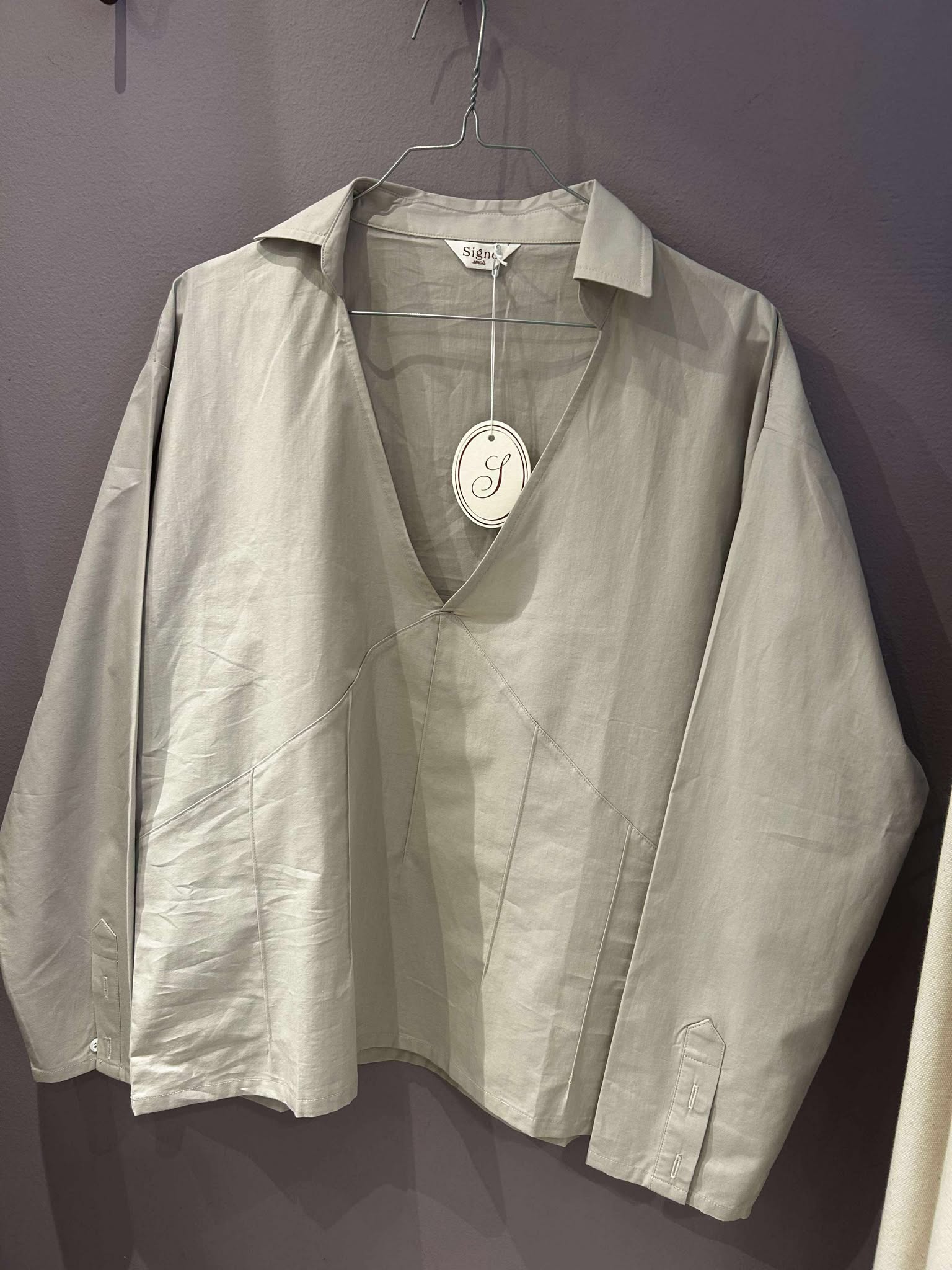 Dora blusen er fremstillet af en mellemvægtig bomuldspoplin og trimmet med en flæse af ren silkesatin.