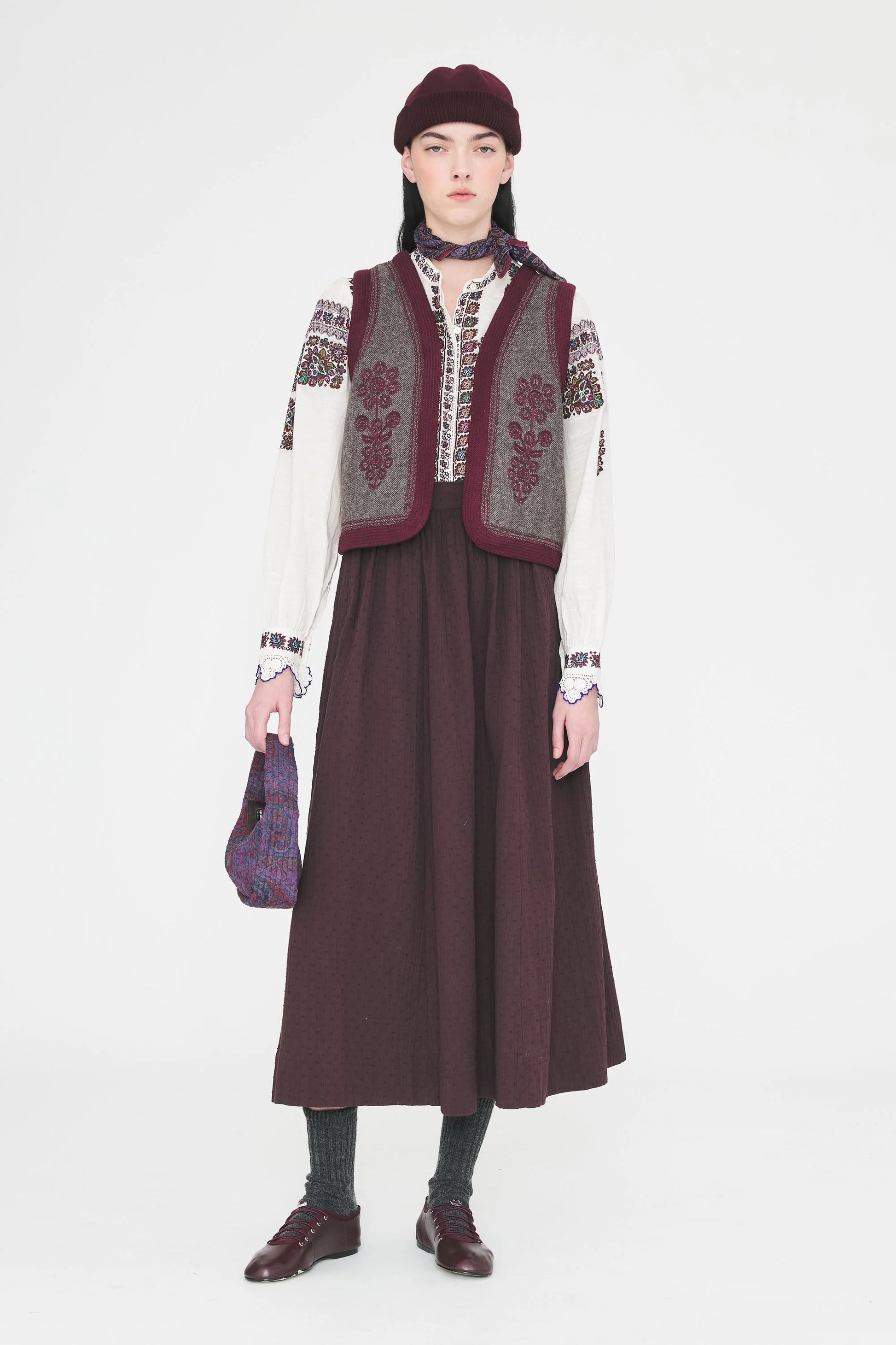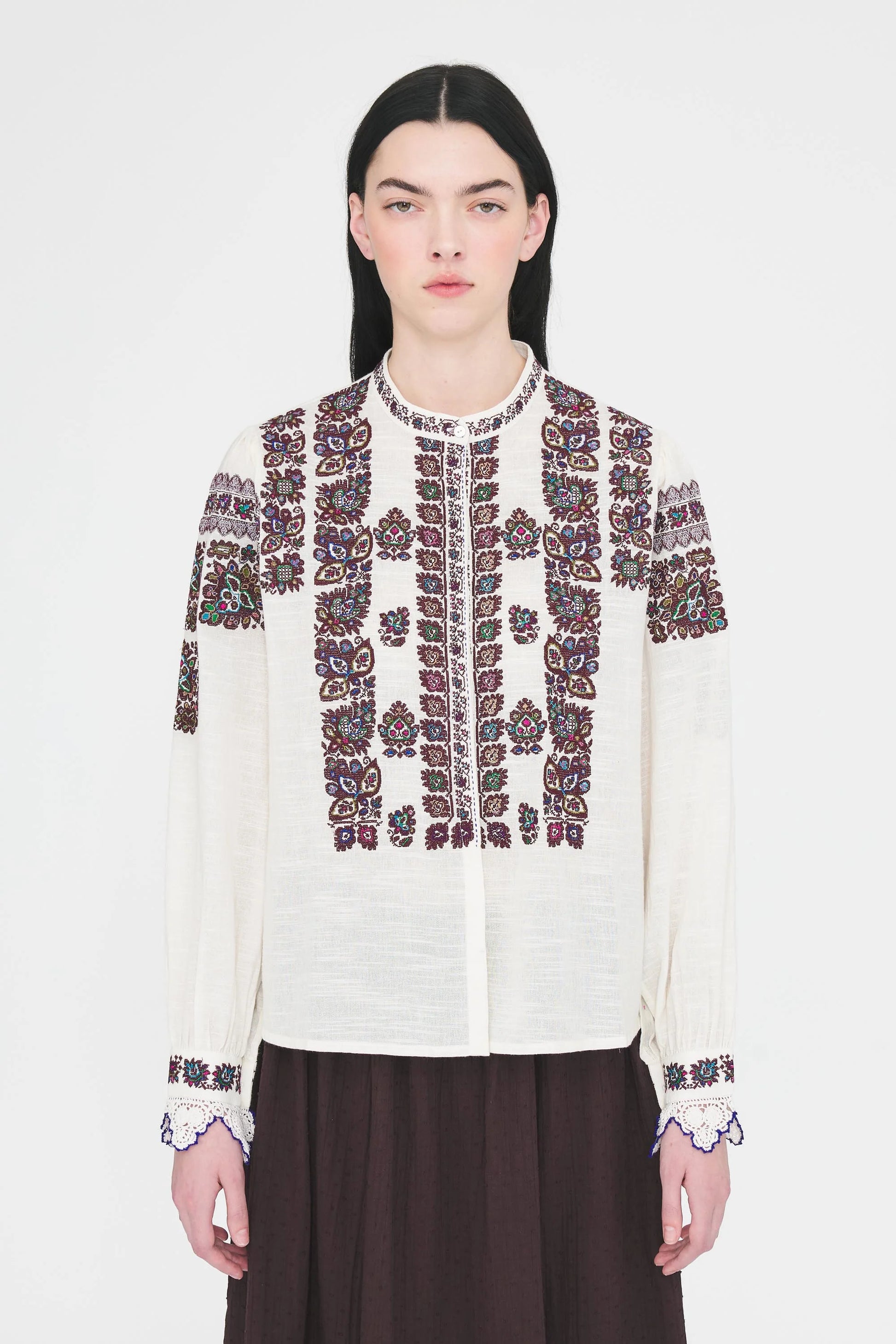 Ungarskinspireret korsstingsbroderet bluse i bomuld med håndhæklet strik ved ærmerne.