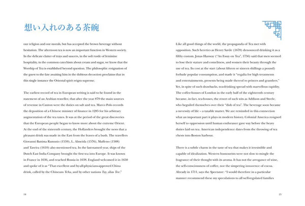 "The Book of Tea", skrevet på engelsk i 1906 til et vestligt publikum, hylder den sekulære kunst i den japanske teceremoni og forbinder dens betydning med zenbuddhisme og taoisme. Denne udsøgt producerede udgave dækker kulturliv, æstetik og filosofi og er lavet med traditionelle kinesiske bogbindteknikker.