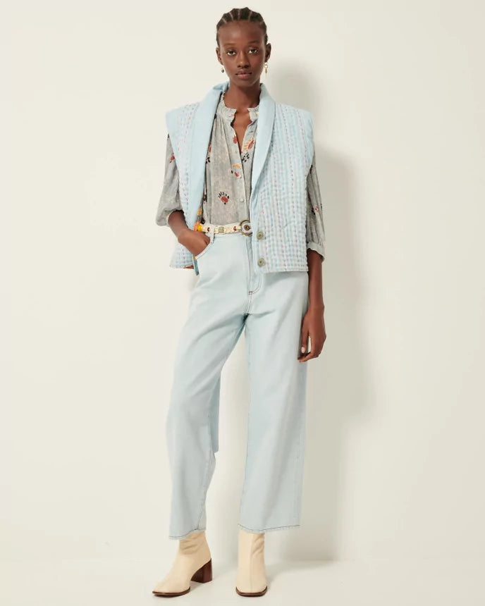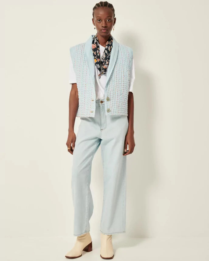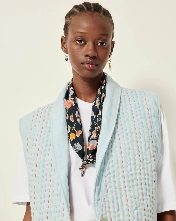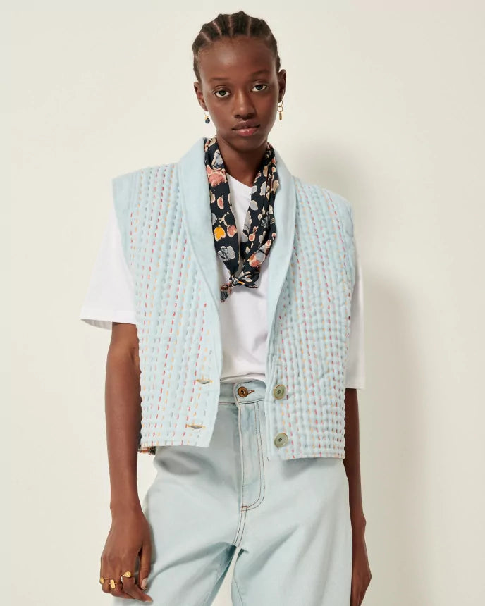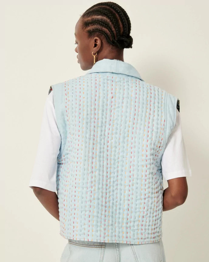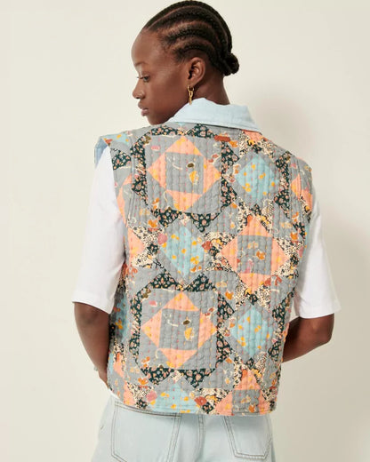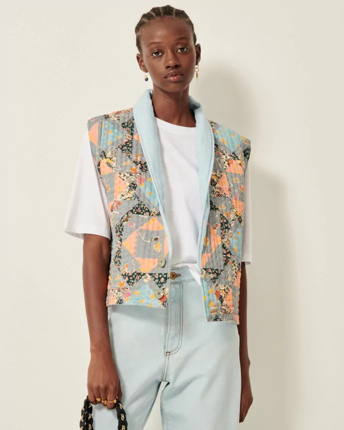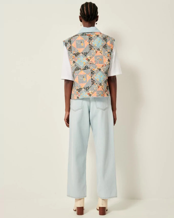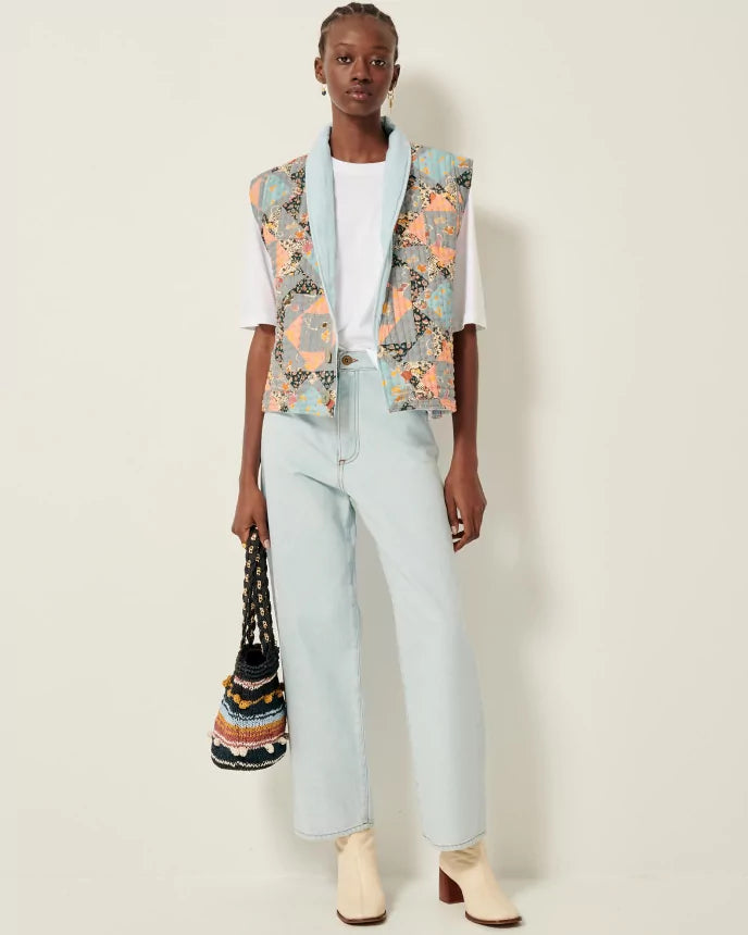 Vest i bouti-stil, polstret topsyet denim, flerfarvede topsting.