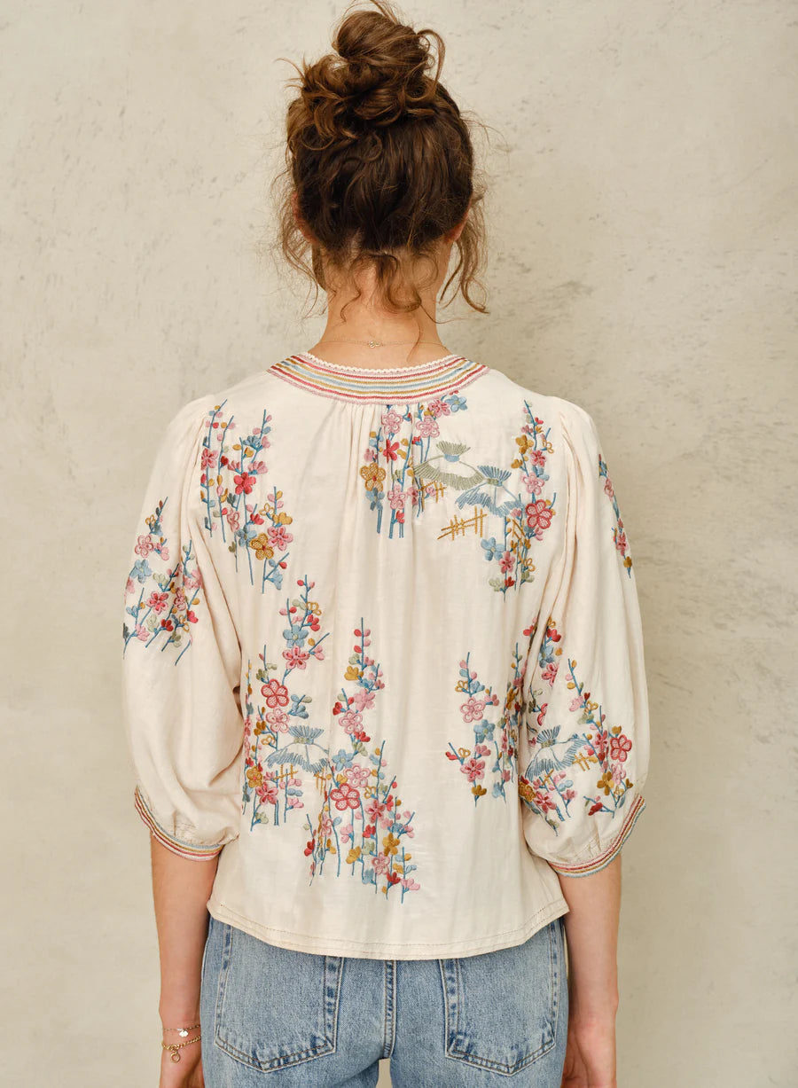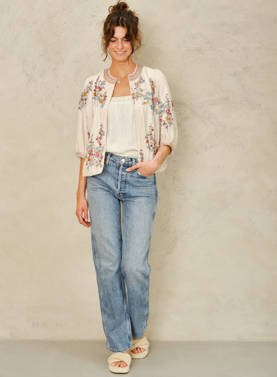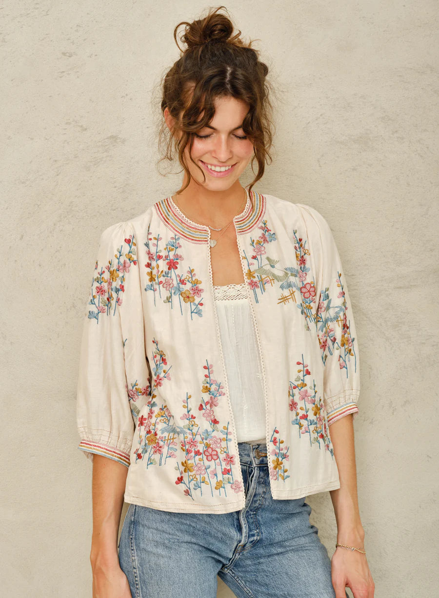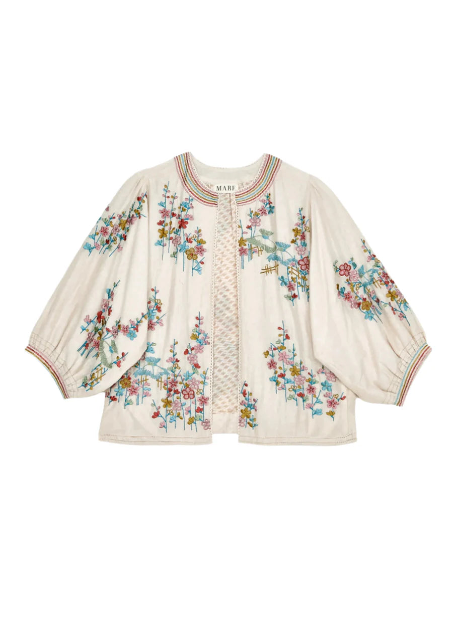 Emi jakken er fremstiller af luksuriøs blød silke. Med smukt blomsterbroderi, blondeindsatser og -kanter og et kontrasttryksfor.