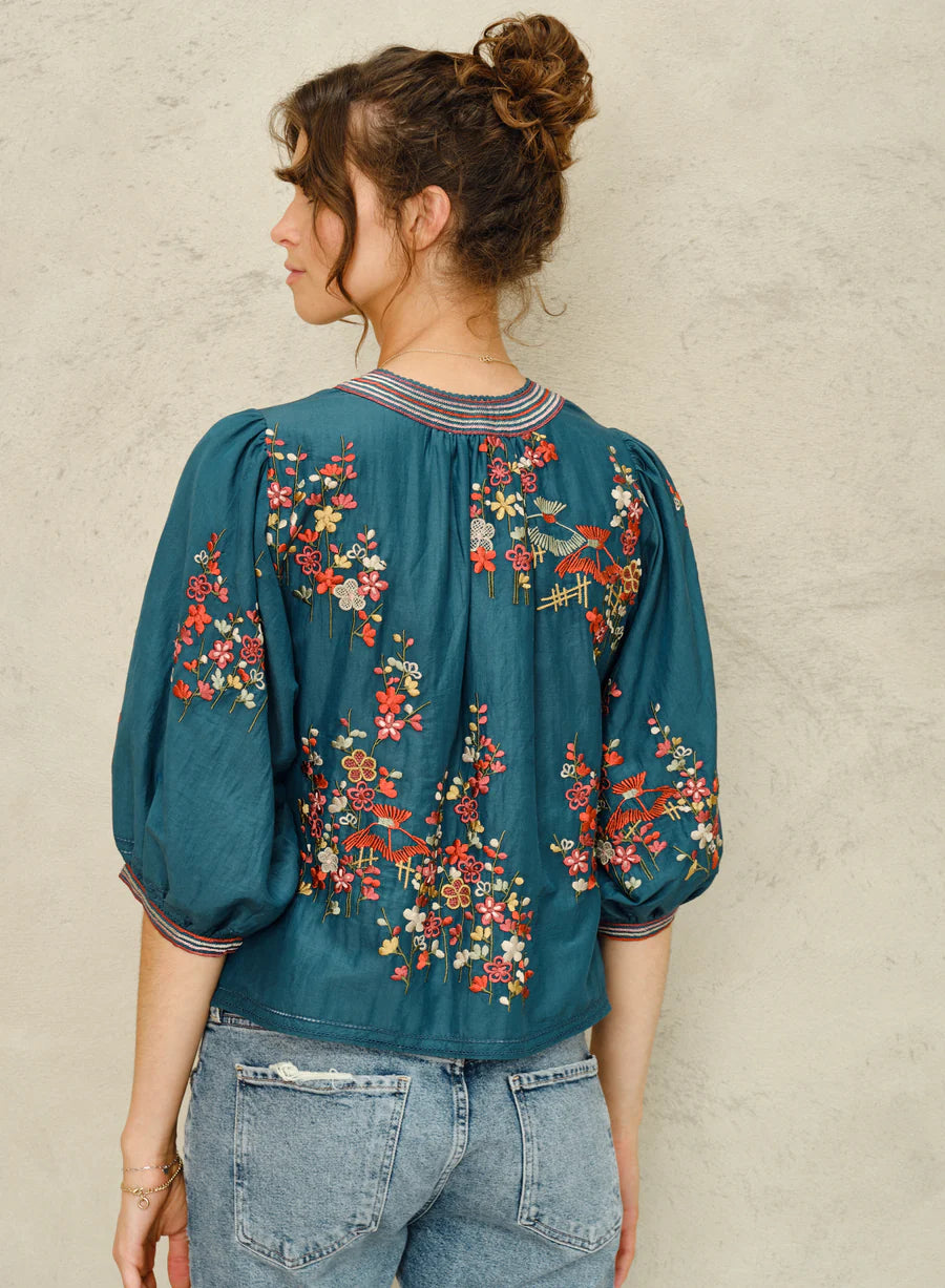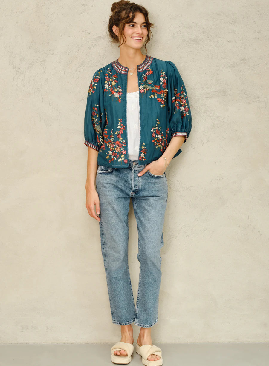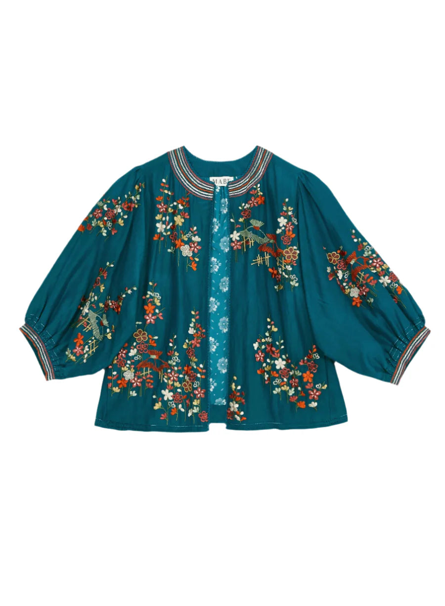 Emi jakken er fremstiller af luksuriøs blød silke. Med smukt blomsterbroderi, blondeindsatser og -kanter og et kontrasttryksfor.