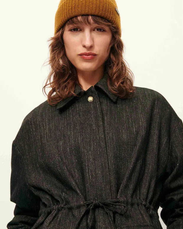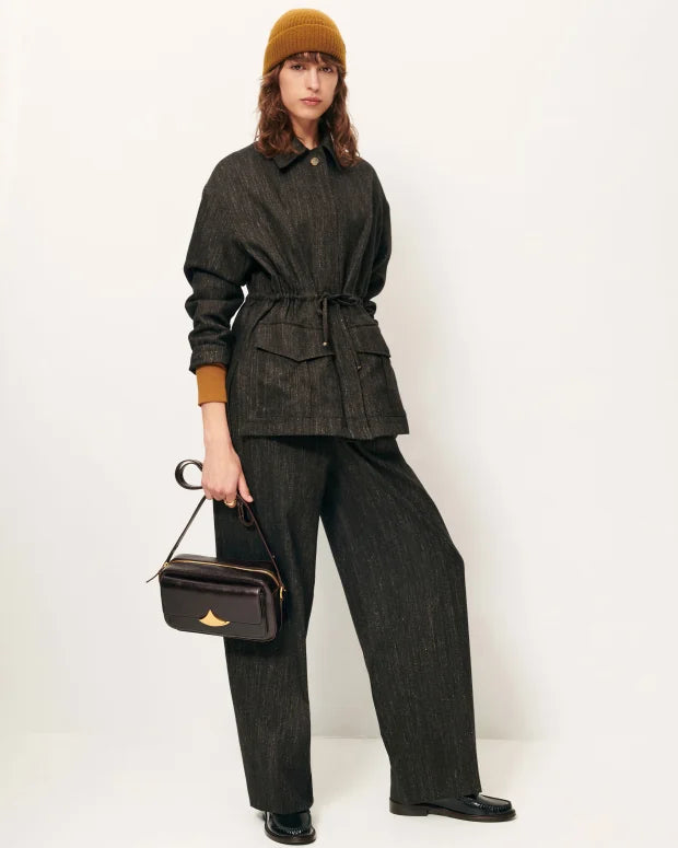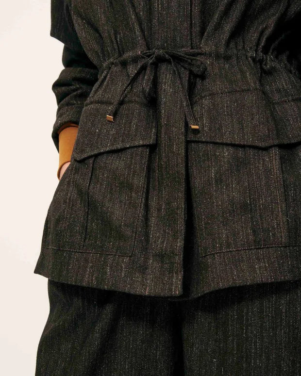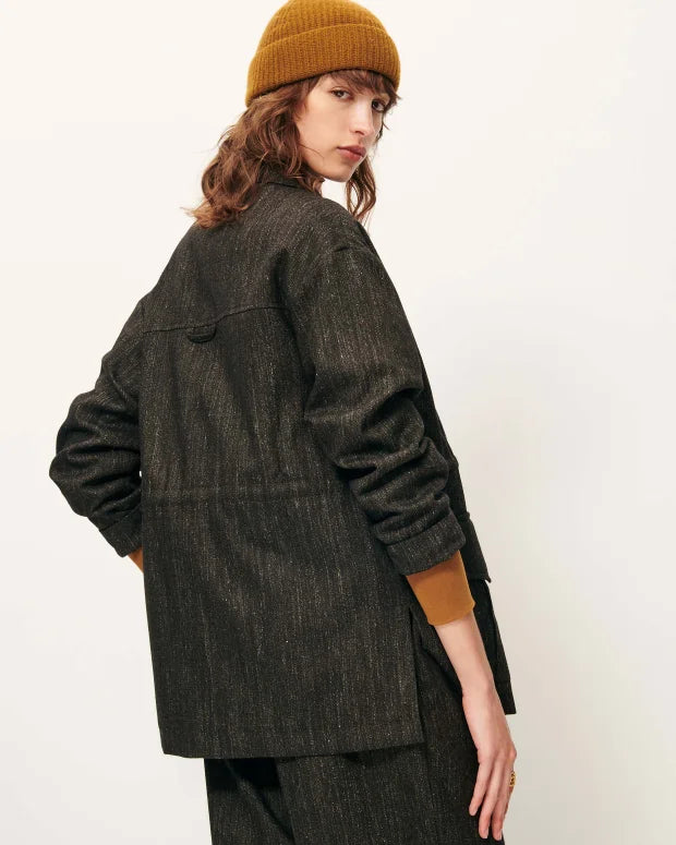 Jakke med påsyede lommer i flot flannel med lyngmønster, vævet i Italien. Tone-i-tone bindebånd i taljen.