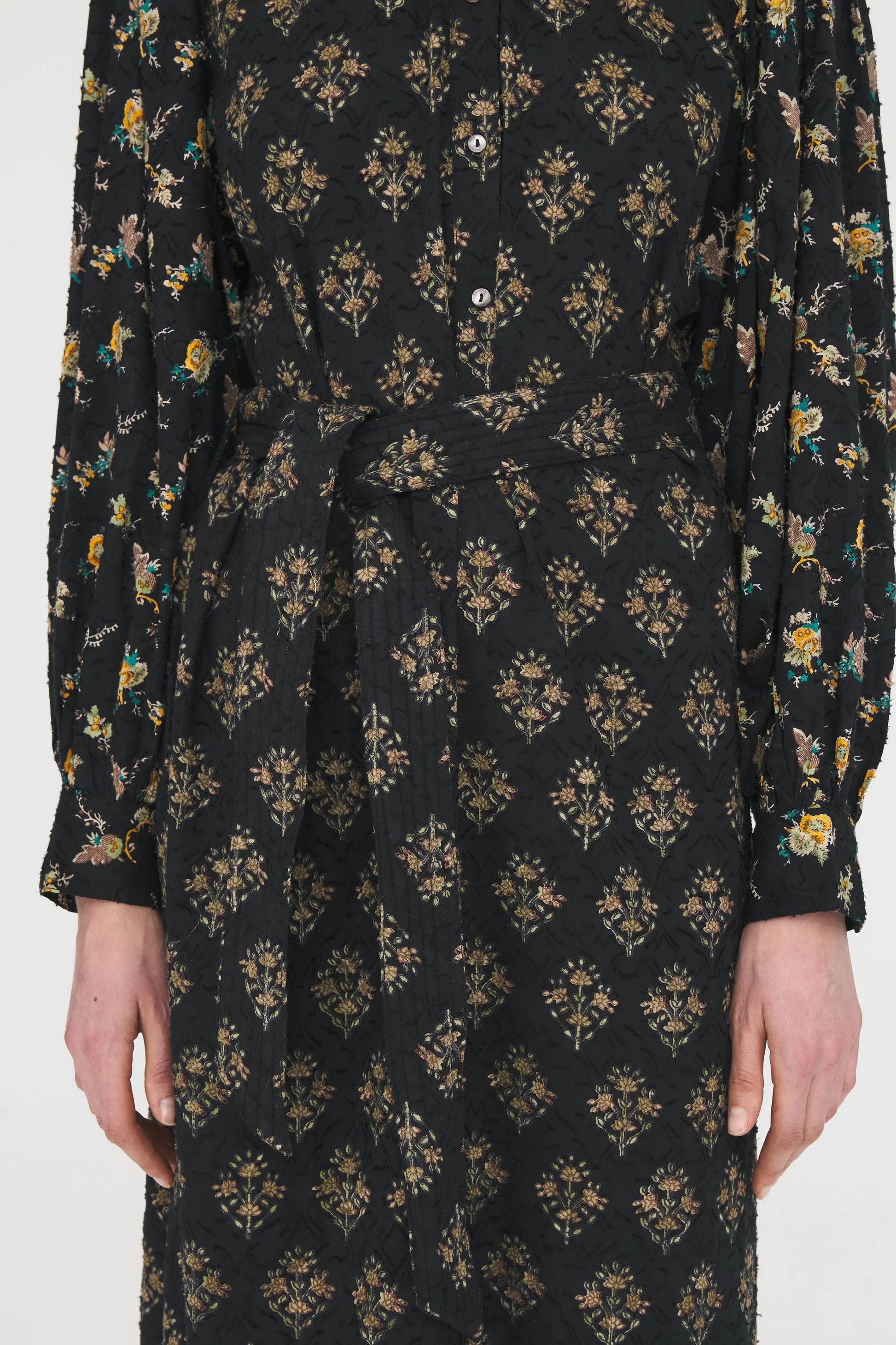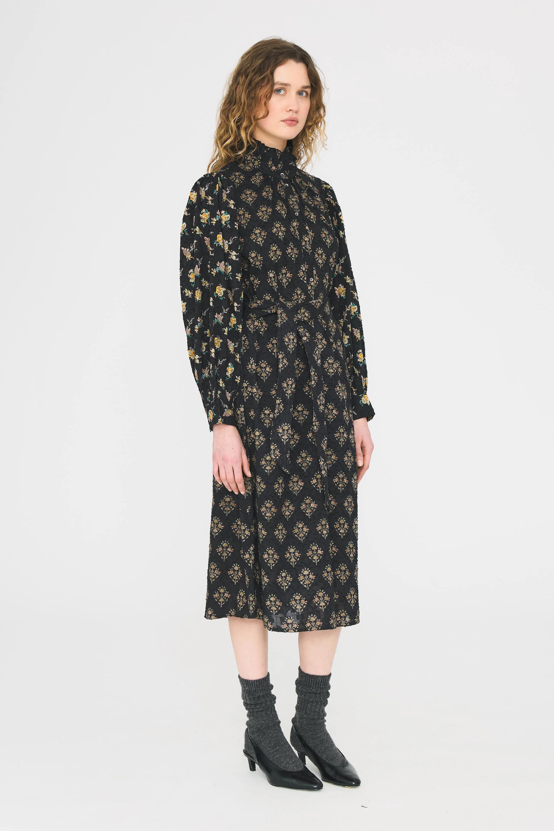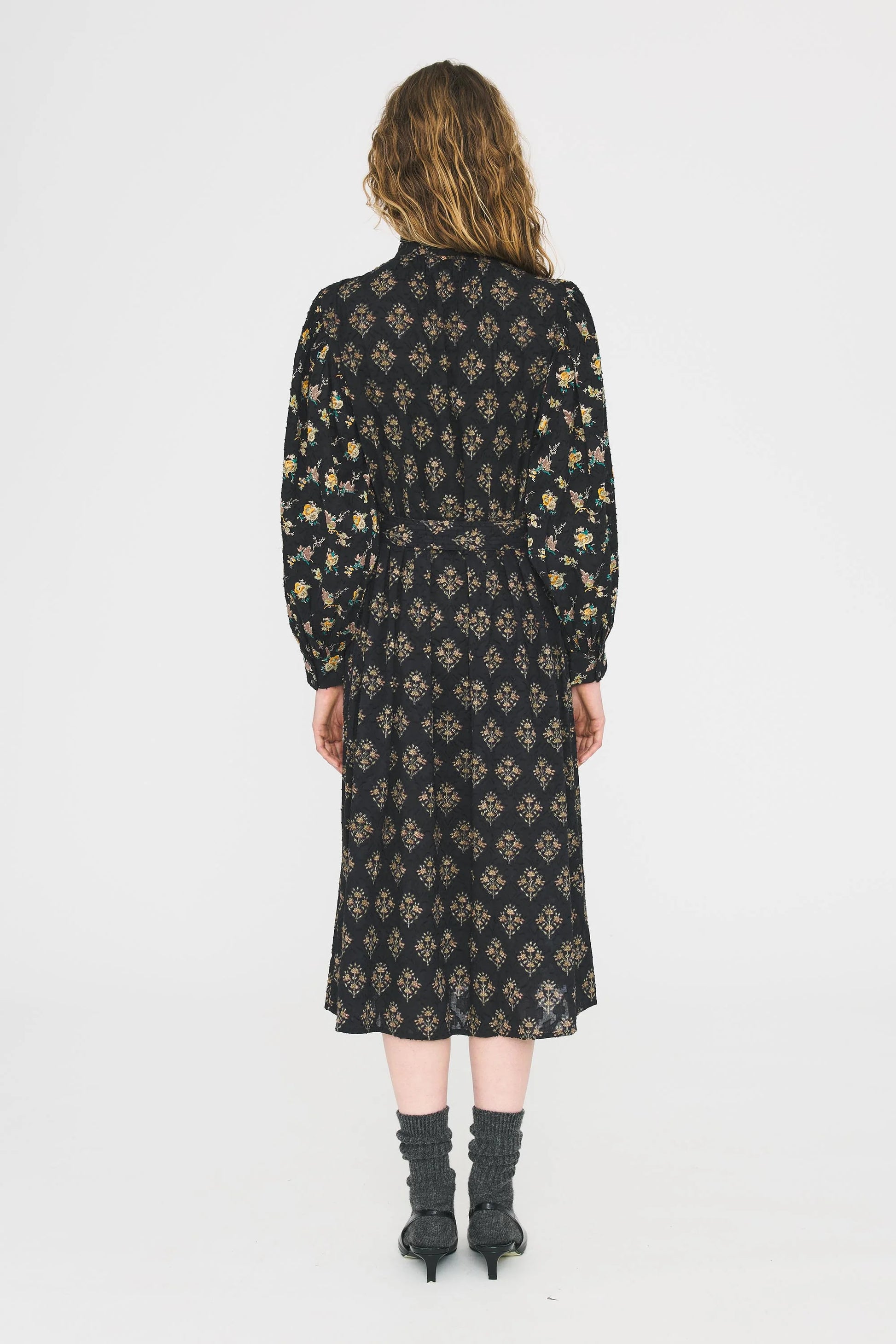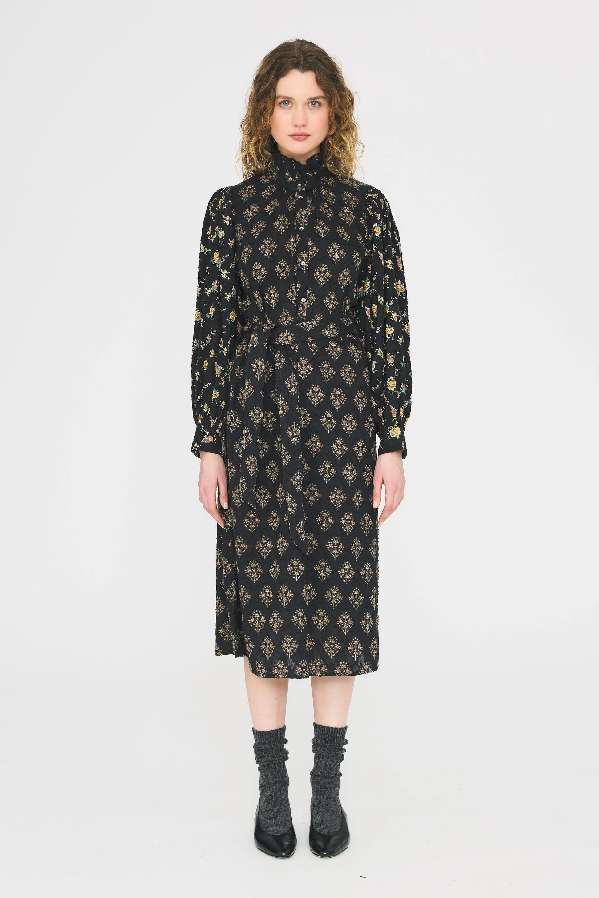 Jacquardkjole i bomuld. Løs pasform. Høj krave. Blusen er lavet af bomulds-jacquardstof, en væveproces med fil-coupé-effekt. De synlige tråde på forsiden er et karakteristisk træk ved dette stof.