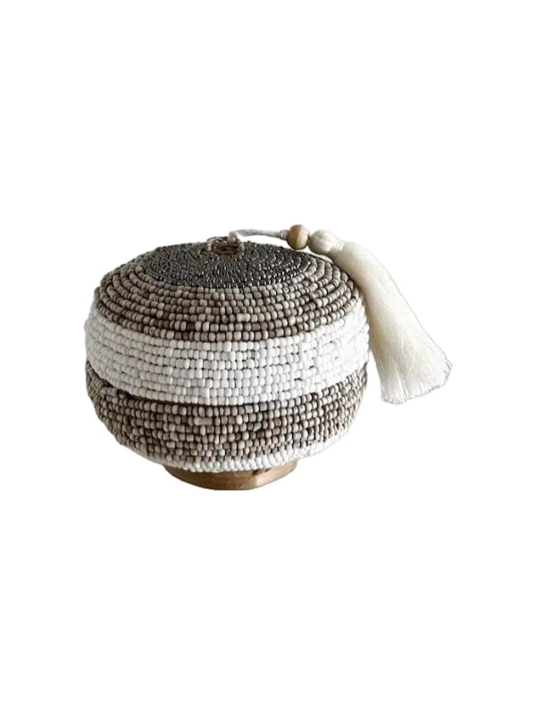 Den smukke kurveæske fra Bali er håndflettet af lokale kvinder i palmeflet med små fine perler påsyet i hånden. Kurvetypen bliver oprindeligt anvendt som opbevaring af madvarer og andre ting i den indonesiske dagligdag; Og med de små perler strøet ud over æskens yderside bliver den utroligt dekorativ at have stående i hjemmet som opbevaring af diverse småting. Den lille æske er foret med bomuldsstof i top og bund, hvilket gør den velegnet til smykke. Den er også sød til hårspænder og andre pigeting, småting på badeværelset, clips på kontoret eller lignende. Den er også en sød lille gaveidé til en du holder af. Kurven er lavet i et kraftigt flet og relativt tung, der giver en god stabilitet.