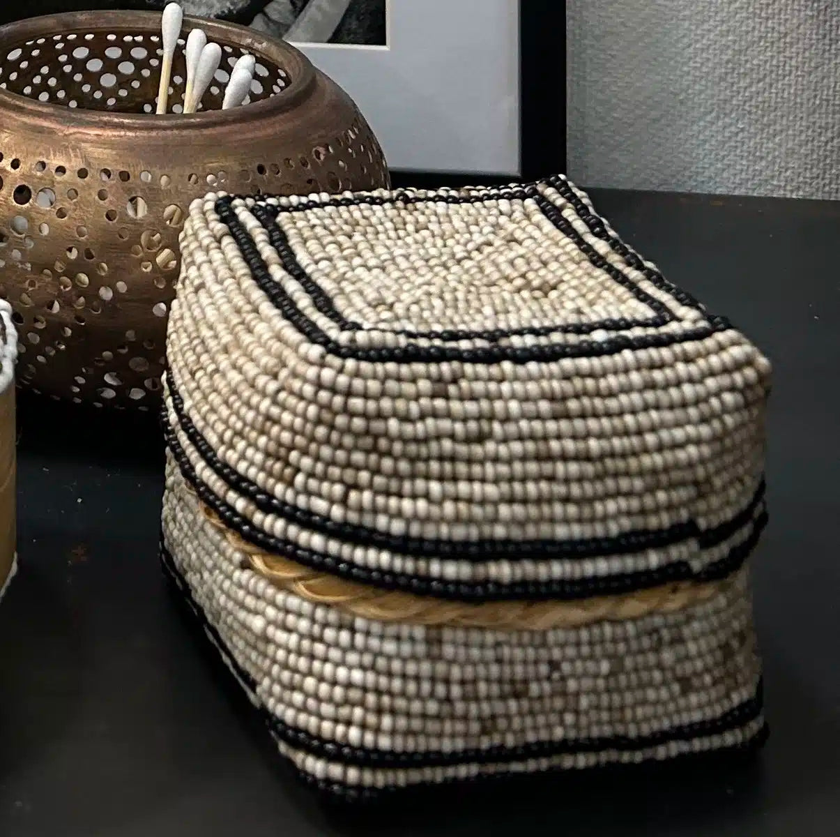 Den smukke kurveæske fra Bali er håndflettet af lokale kvinder i palmeflet med små fine perler påsyet i hånden. Kurvetypen bliver oprindeligt anvendt som opbevaring af madvarer og andre ting i den indonesiske dagligdag; Og med de små perler strøet ud over æskens yderside bliver den utroligt dekorativ at have stående i hjemmet som opbevaring af diverse småting. Brug mini udgaven her til smykker, hårspænder og andre pigeting, småting på badeværelset, clips på kontoret eller lignende. Den er også en sød lille gaveidé til en du holder af. Kurven er lavet i et kraftigt flet og relativt tung, der giver en god stabilitet.