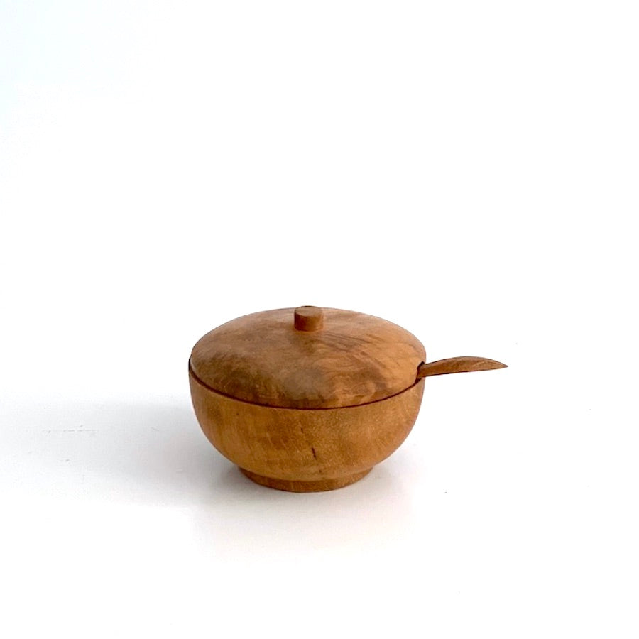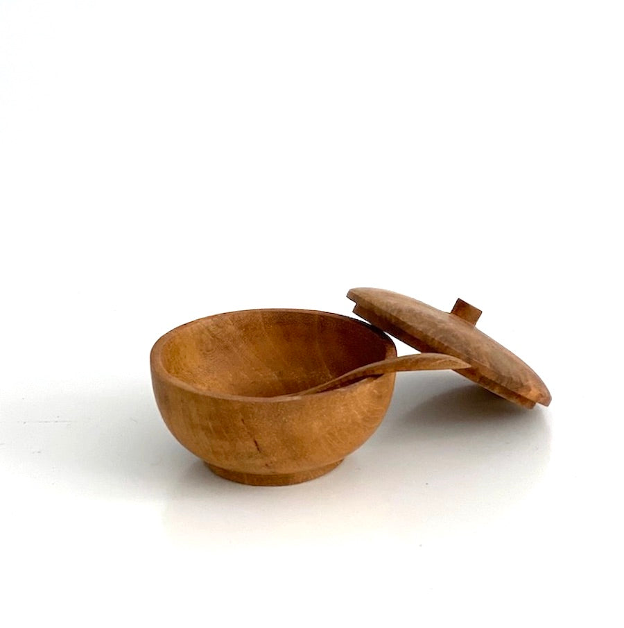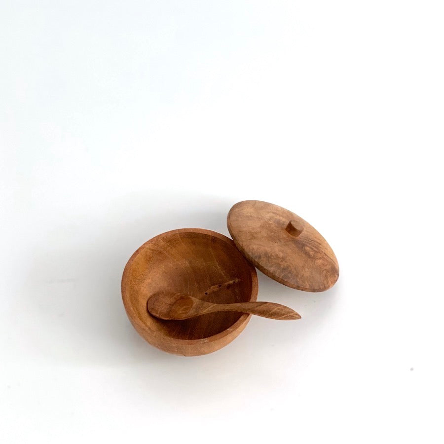 Det lille saltkar med låg og ske er håndskåret i bæredygtigt og certificeret teaktræ fra de store skovområder på Bali og Java. Karret er meget fint snittet af dygtige, lokale snedkere på Bali og er en både smuk og hygiejnisk løsning til både salt og peber i køkkenet og på spisebordet.