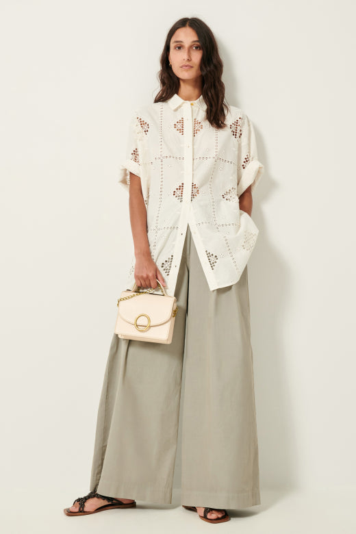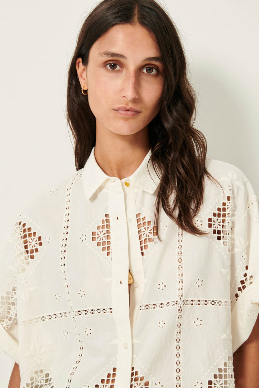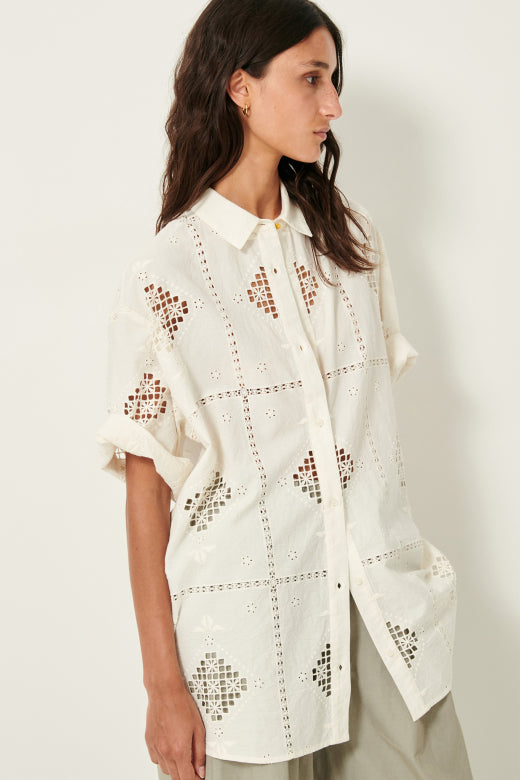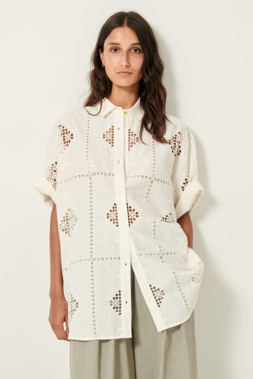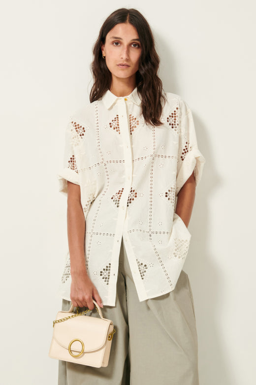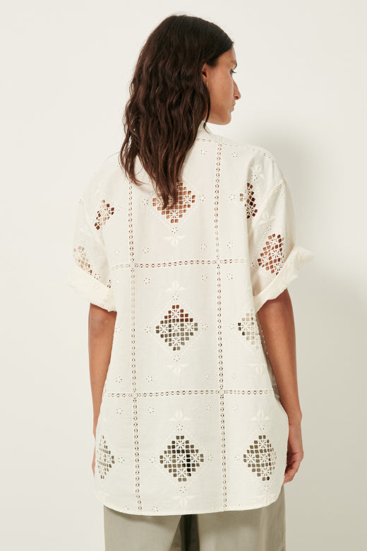 Løs pasform kortærmet skjorte i let bomuldspoplin med gennemgående trousseau-inspireret openwork broderi, eksklusivt Sessùn-mønster.