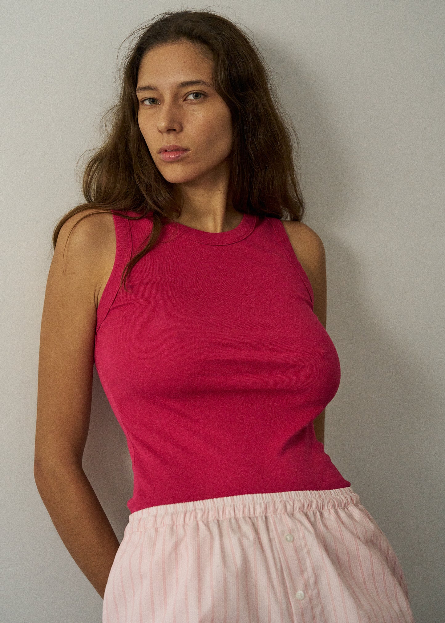 En ikonisk basisstil, der har været en del af kollektionen siden den første lancering i 2017. June tanktop har en klassisk, figursyet pasform med en flatterende rund crewneck. Fremstillet i blød, økologisk bomuld for maksimal komfort og prydet med en subtil monogrambrodering i nakken.