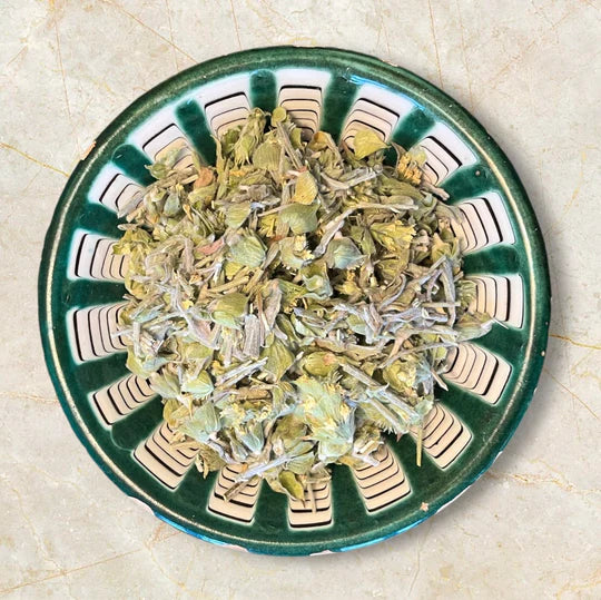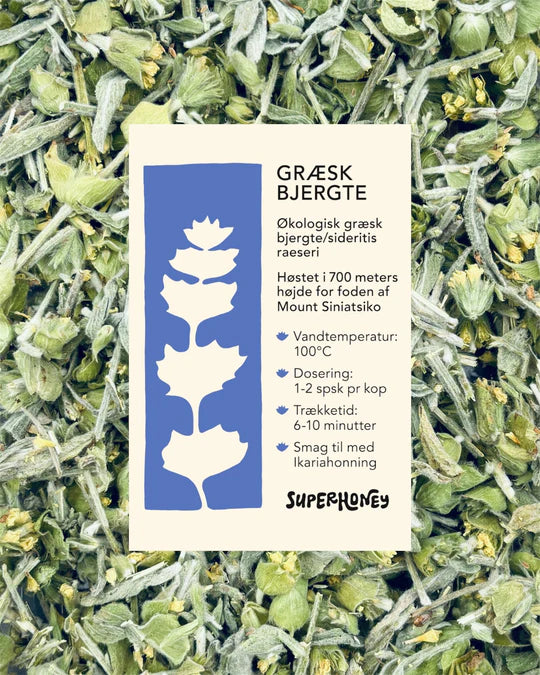 Økologisk græsk bjergte (Sideritis Raeseri) i rustikke stykker bestående af blomster, stilke og blade. Smagen er aromatisk, grøn og urtet.