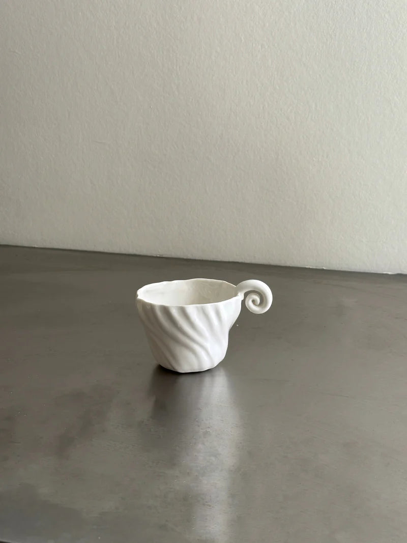Koppen er håndlavet i Århus af det fineste hvide porcelænsler og passer perfekt i din kop-reol.