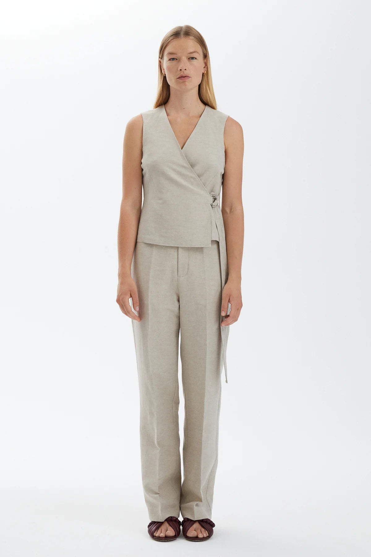 Zoey er en kort omslags-top, der lukkes med et fastsyet bælte, udstyret med D-ringe. Den er lavet af en lækker blanding af bomuld og hør, hvilket giver den et sommerligt udtryk.