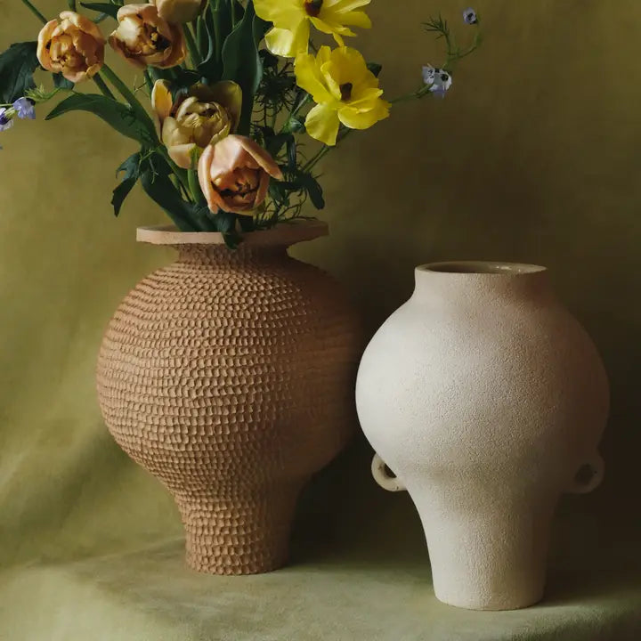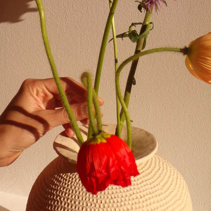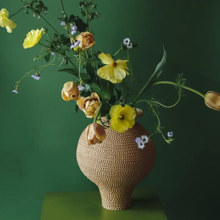 Inspireret af valmueblomsten er Ecume-vasen meget rund. Den er kun emaljeret på indersiden, og dens rå udseende fremhæver jorden, her sandsten.