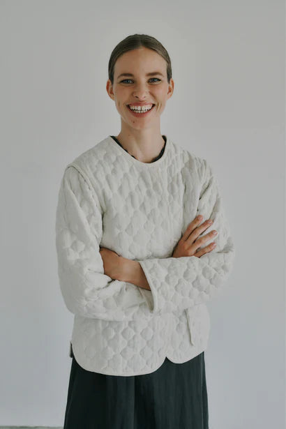 En dejlig quiltet jakke med bindebånd fra den danske designer Anne-Mi. Perfekt som erstatning for en strik eller blazer, eller som en let overgangsjakke.